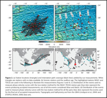 To investigate whether a mantle plume lies beneath Tristan da Cunha, we deployed a network of ocean-bottom seismometers on the seafloor around the island. These instruments recorded vibrations from distant earthquakes, allowing us to measure how fast seismic waves travel through the Earth beneath Tristan.