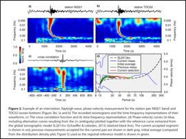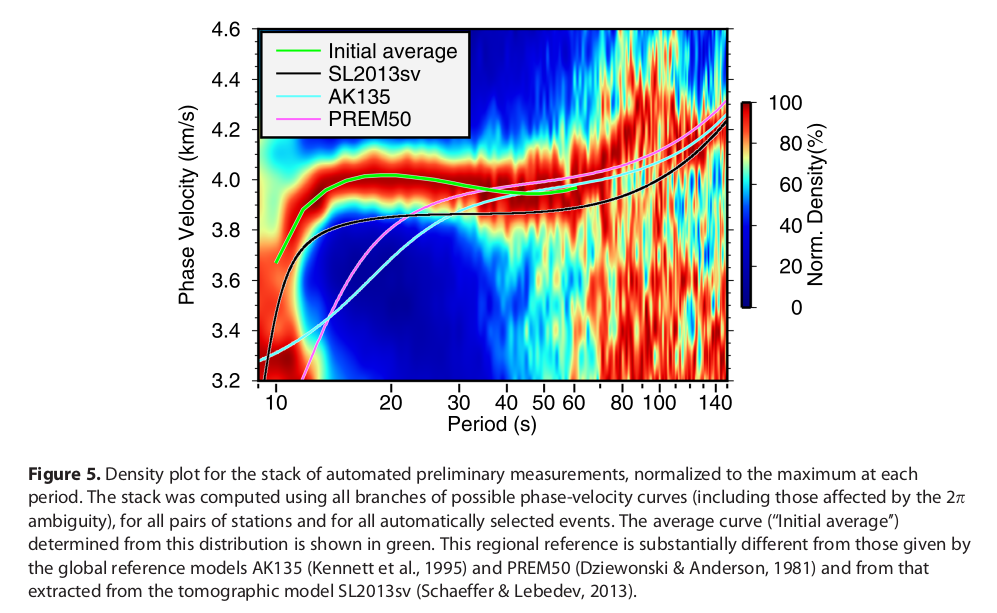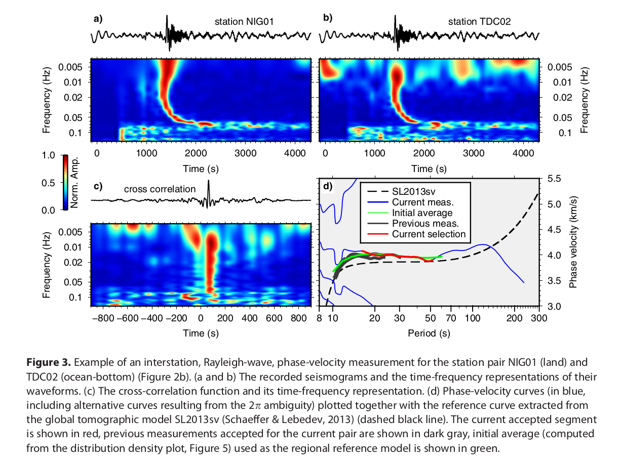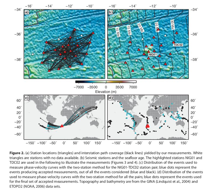 The ocean-bottom data set presented some challenges, which required data-processing and measurement approaches different from those tuned for land-based arrays of stations. Having derived a robust, phase-velocity curve for the Tristan area, we inverted it for a shear wave velocity profile using a probabilistic (Markov chain Monte Carlo) approach. The model shows a pronounced low-velocity anomaly from 70 to at least 120 km depth. Vs in the low velocity zone is 4.1–4.2 km/s, not as low as reported for Hawaii (∼4.0 km/s), which probably indicates a less pronounced thermal anomaly and, possibly, less partial melting.