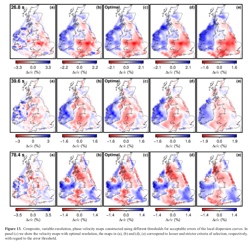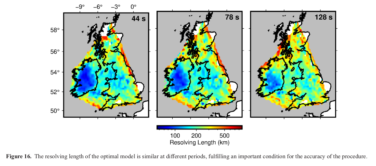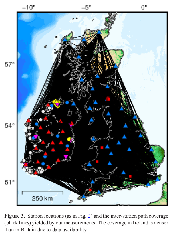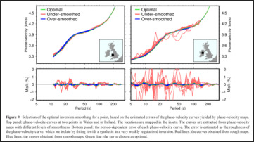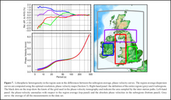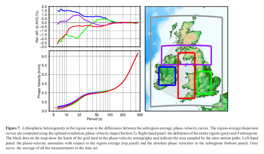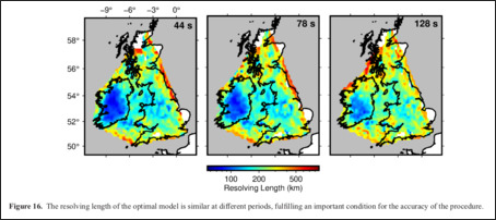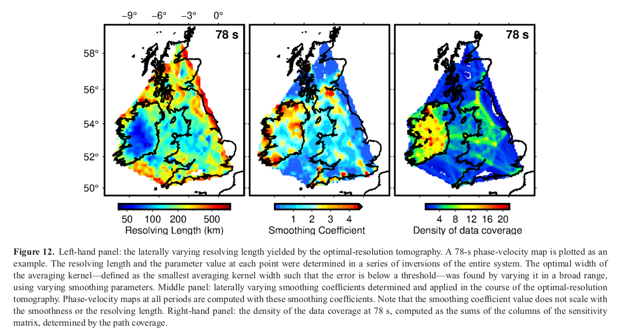 We apply the method to image the lithosphere and underlying mantle beneath Ireland and Britain. Our very large data set was created using new data from Ireland Array, the Irish National Seismic Network, the UK Seismograph Network and other deployments. A total of 11 238 inter-station dispersion curves, spanning a very broad total period range (4–500 s), yield unprecedented data coverage of the area and provide fine regional resolution from the crust to the deep asthenosphere. The lateral resolution of the 3-D model is computed explicitly and varies from 39 km in central Ireland to over 800 km at the edges of the area, where the data coverage declines. Our tomography reveals pronounced, previously unknown variations in the lithospheric thickness beneath Ireland and Britain, with implications for their Caledonian assembly and for the mechanisms of the British Tertiary Igneous Province magmatism.