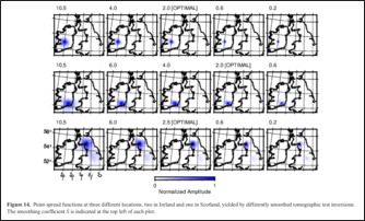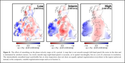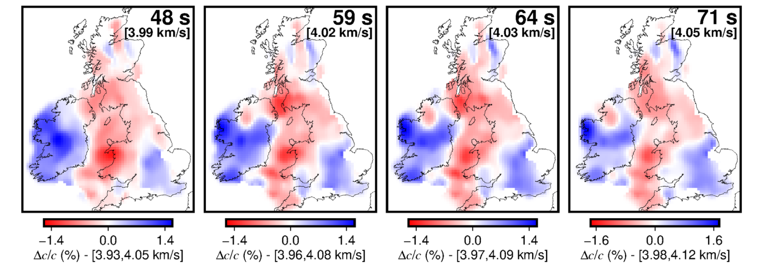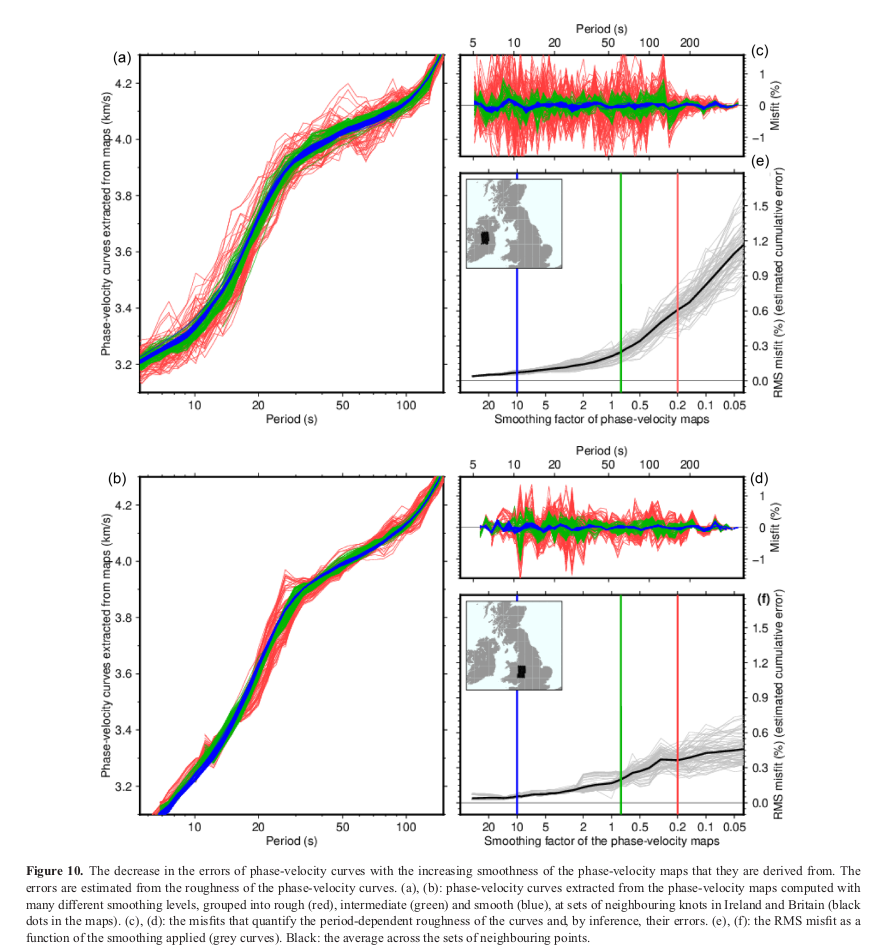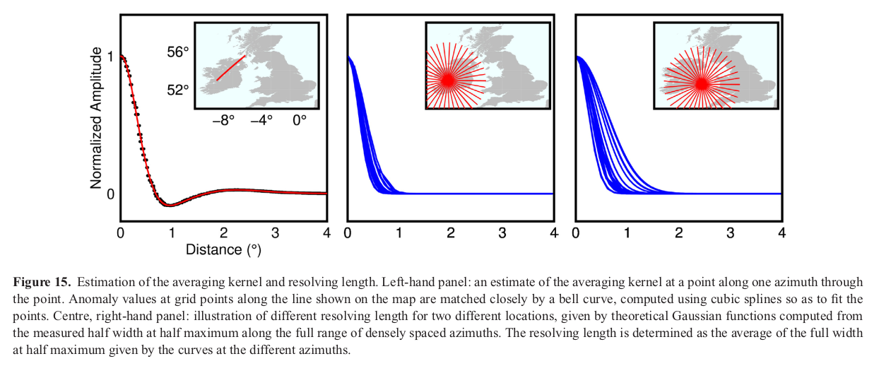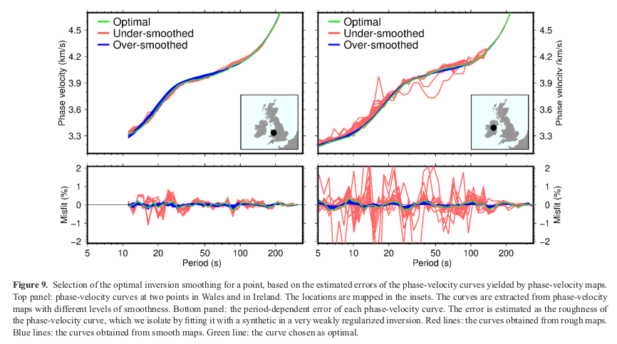 We apply the method to image the lithosphere and underlying mantle beneath Ireland and Britain. Our very large data set was created using new data from Ireland Array, the Irish National Seismic Network, the UK Seismograph Network and other deployments. A total of 11 238 inter-station dispersion curves, spanning a very broad total period range (4–500 s), yield unprecedented data coverage of the area and provide fine regional resolution from the crust to the deep asthenosphere. The lateral resolution of the 3-D model is computed explicitly and varies from 39 km in central Ireland to over 800 km at the edges of the area, where the data coverage declines. Our tomography reveals pronounced, previously unknown variations in the lithospheric thickness beneath Ireland and Britain, with implications for their Caledonian assembly and for the mechanisms of the British Tertiary Igneous Province magmatism.