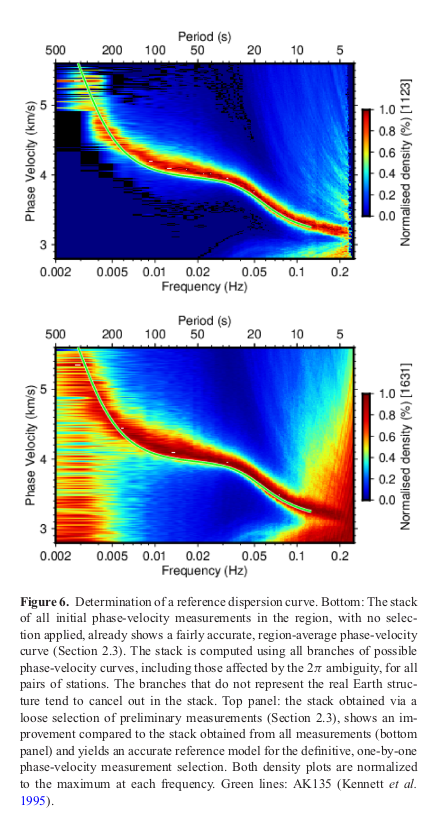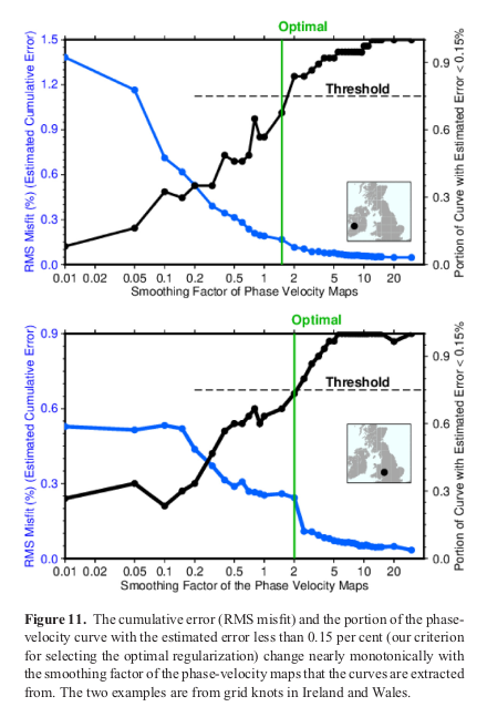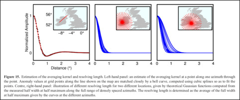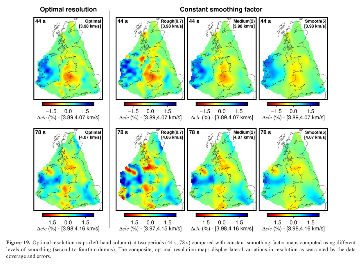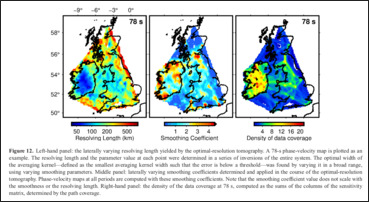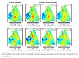 A 3-D VS model is then computed by the inversion of the composite phase-velocity maps with an optimal resolution at every point. The estimated optimal resolution shows smooth lateral variations, confirming the robustness of the procedure. Importantly, the optimal resolving length does not scale with the density of the data coverage: some of the best-sampled locations display relatively low lateral resolution, probably due to systematic errors in the data.